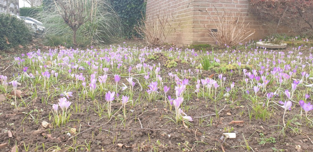 Ik word blij van: sneeuwklokjes, krokussen, mussen, roodborstjes, zon. De eerste blaadjes aan verder kale takken. De merel die ’s ochtends het hoogste lied zingt en daarmee de meest lieflijke wekker is die ik me kan wensen. Dat ik mijn super toffe groene leren jasje dat ik van de leuke jongen uit de trein kreeg weer kan dragen in plaats van een winterjas. Al kan het niet goed zijn dat het nu al zo warm is.