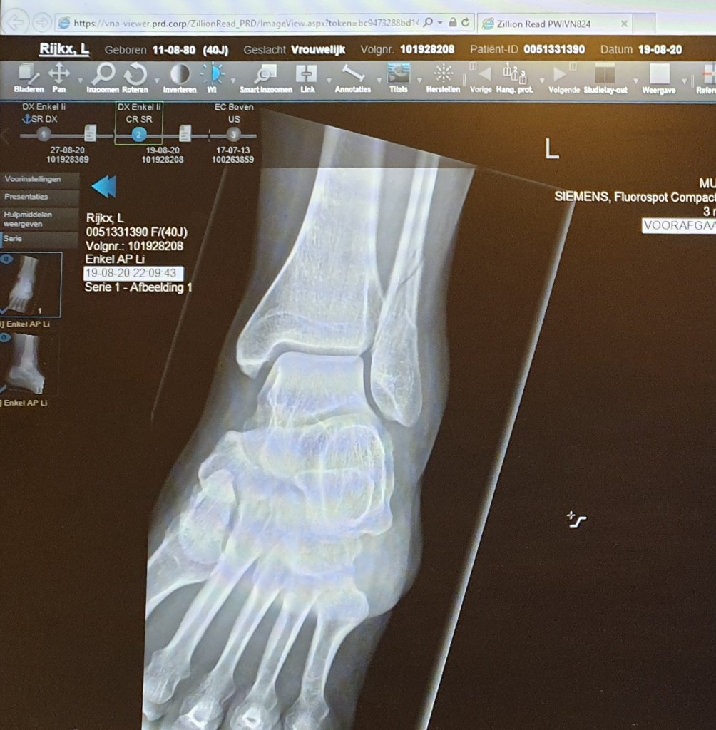 De leuke jongen uit de trein zag mij wit wegtrekken en verloor langzaam de hoop dat ik ‘slechts’ mijn enkel had verstuikt. Uren later bij de eerste hulp kwam de bevestiging dat de vakantie compleet om zeep was: “Dat is stuk.”